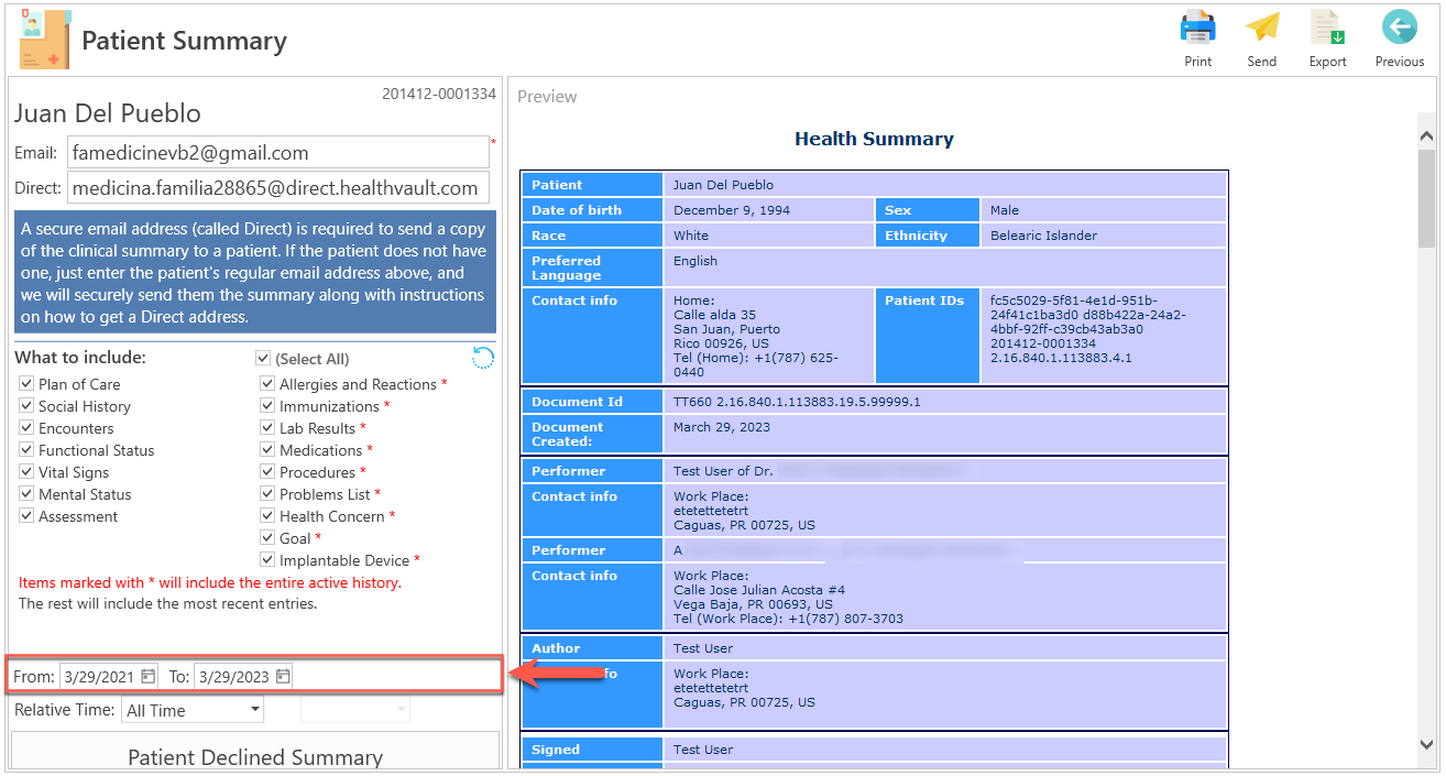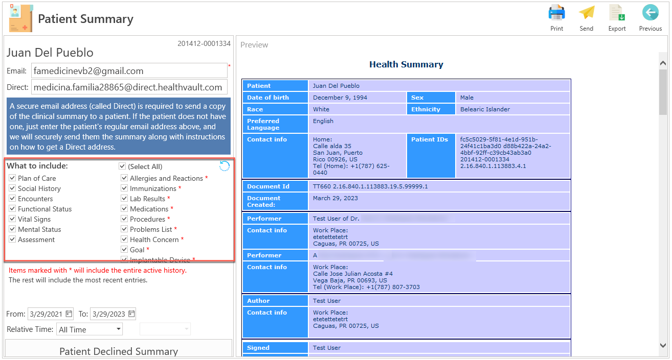 - Select all the sections, which you wish to include in the patient's clinical summary report, in the following section: (Items identified with an asterisk *, will display the patient's entire active history).