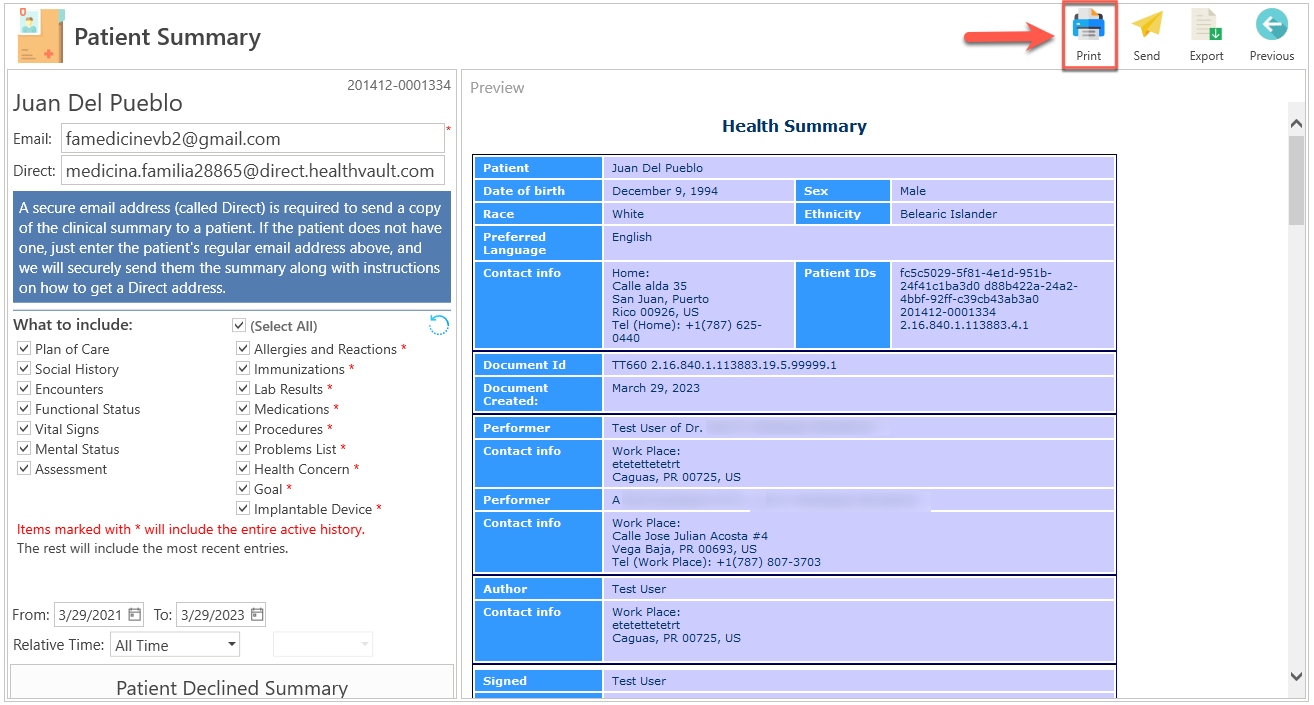 - Once you have selected everything to include in the patient's clinical summary, press the Print button located at the top of the screen.