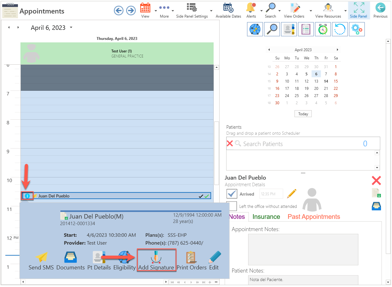 Press the Signatures button at the top of the screen. (The patient must be cited and registered as having arrived at the office).