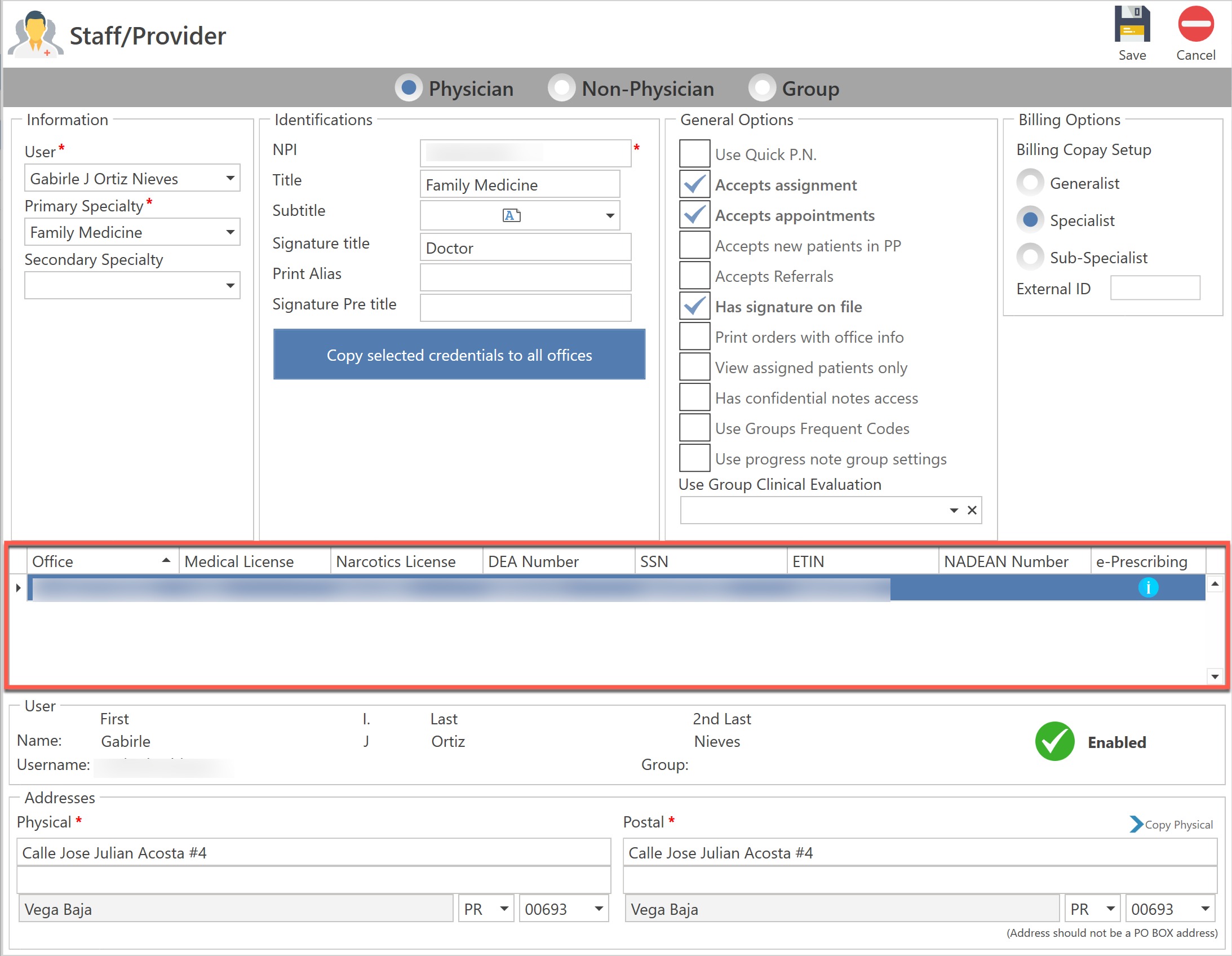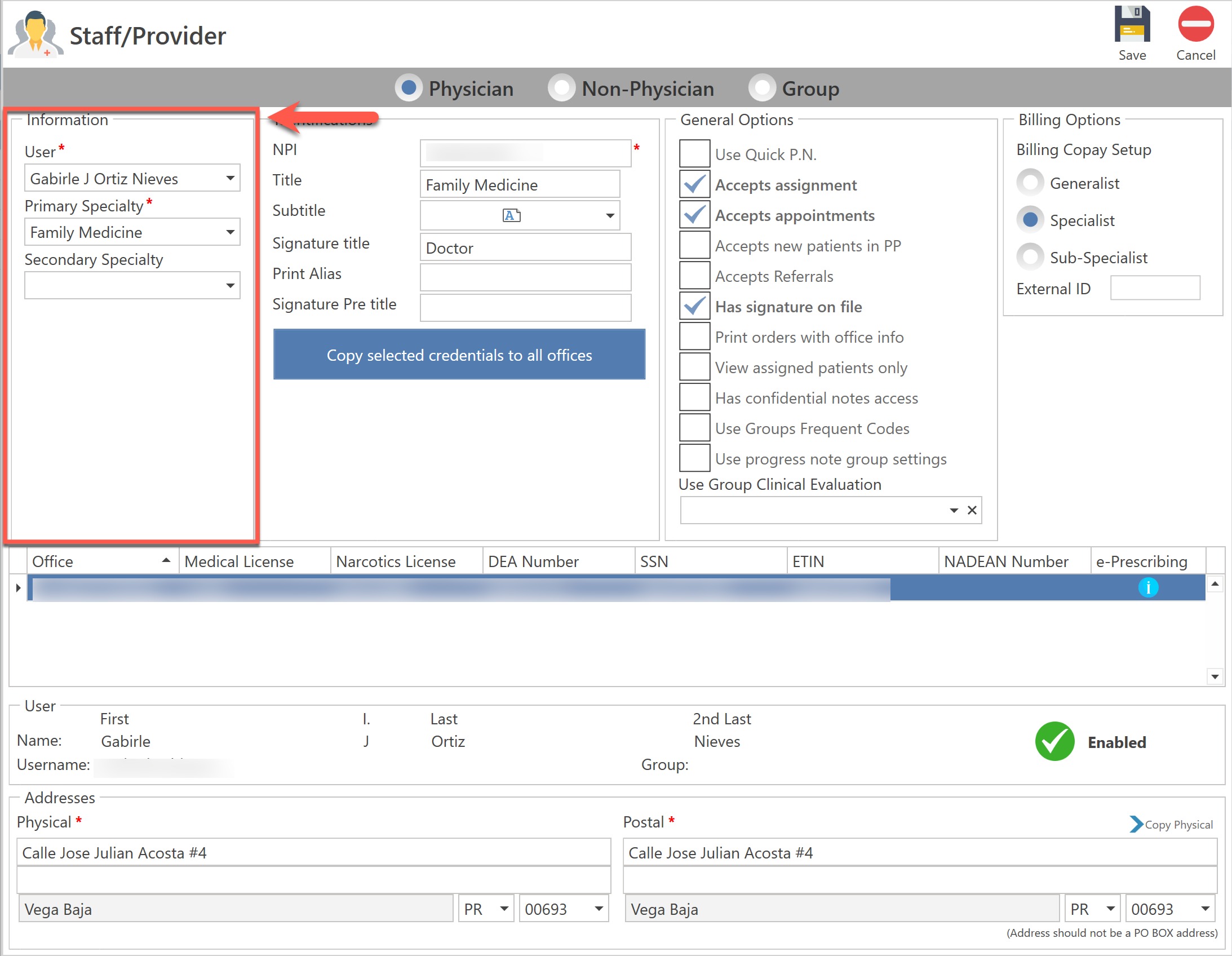 - Select the user, which you want to configure in the Staff/Providers screen. Select the primary and secondary specialty, if any, of the selected provider.