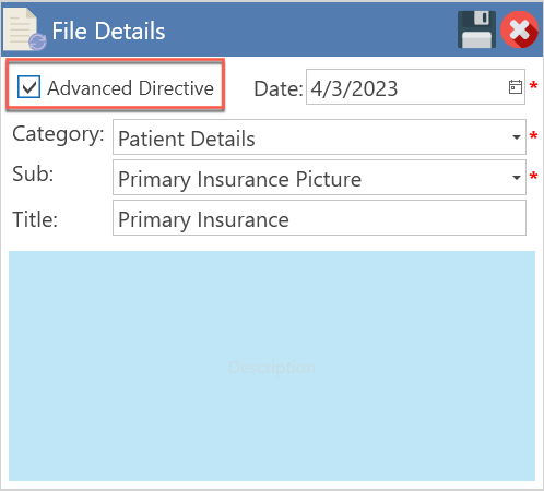 Select the Advanced Directive checkbox to identify that the document is an advance directive.