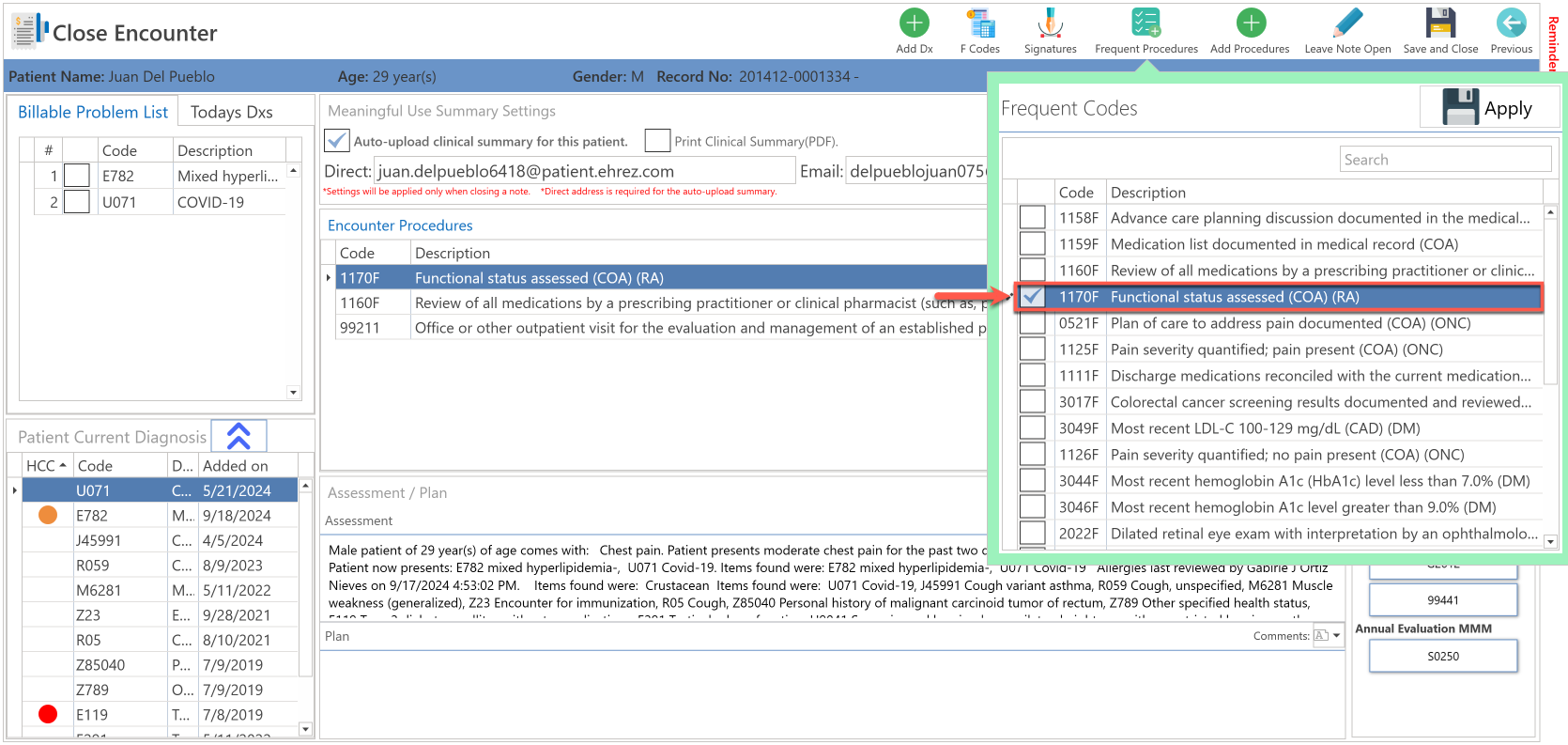 - Select the frequent code, which you want to add to the patient's clinical evaluation encounter.