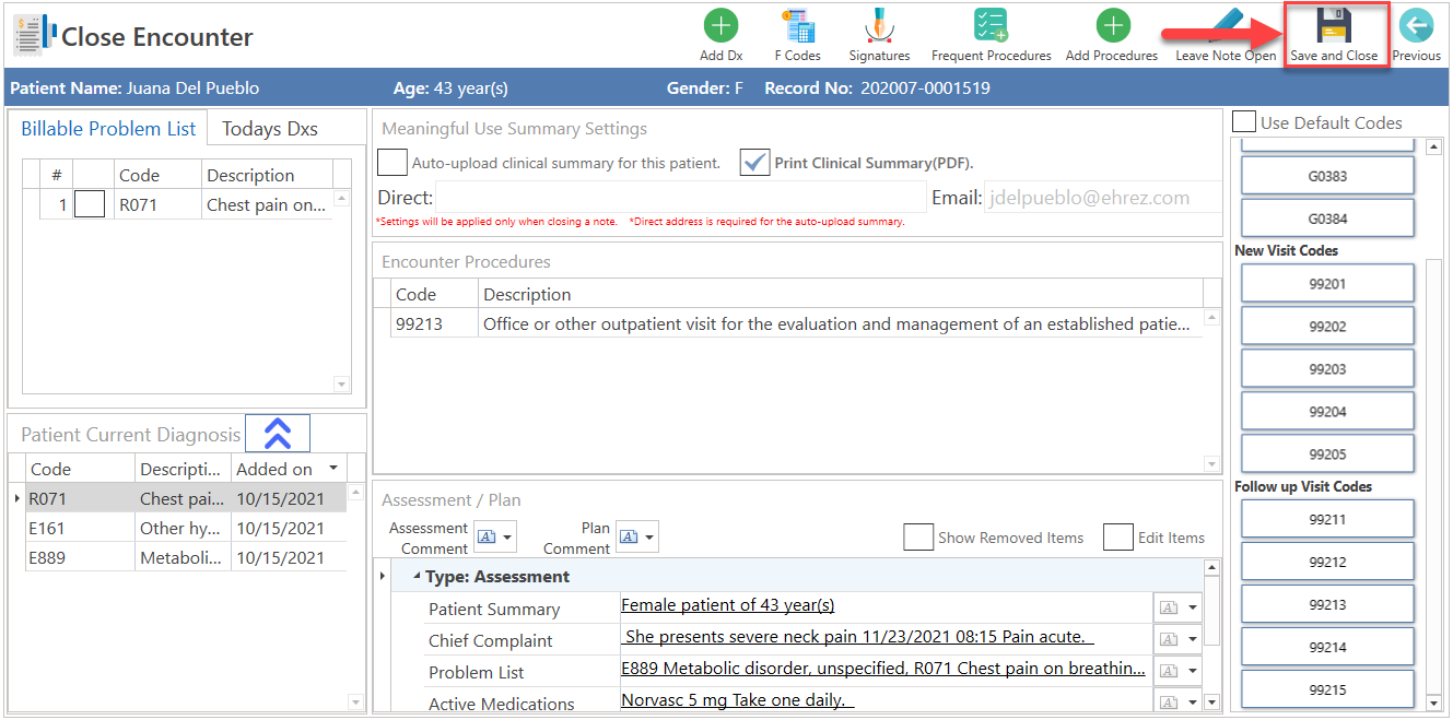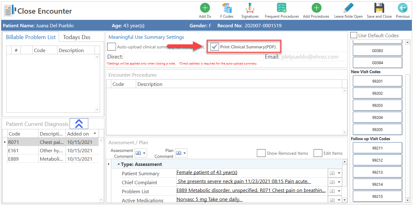 - Once in the Close Encounter screen select the Print Clinical Summary (PDF) option.