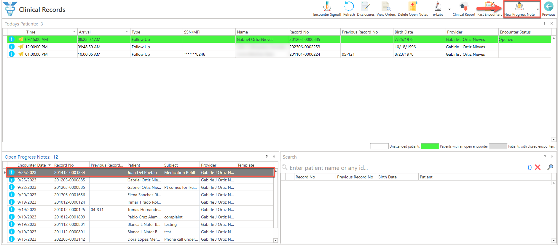 - Once the patient is selected, press the New Progress Note button located at the top of the screen.