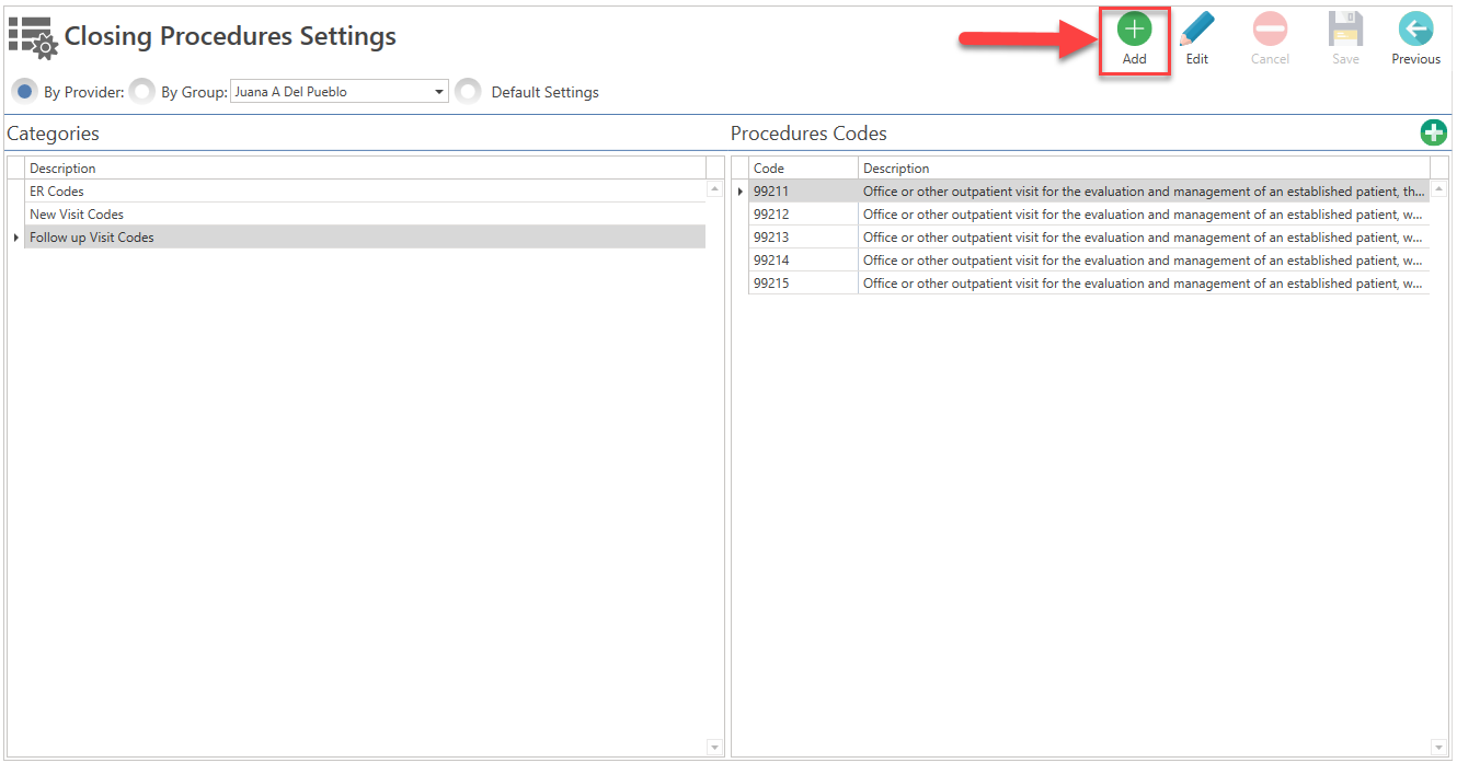 - Select the provider, to which you want to configure the custom procedure codes.