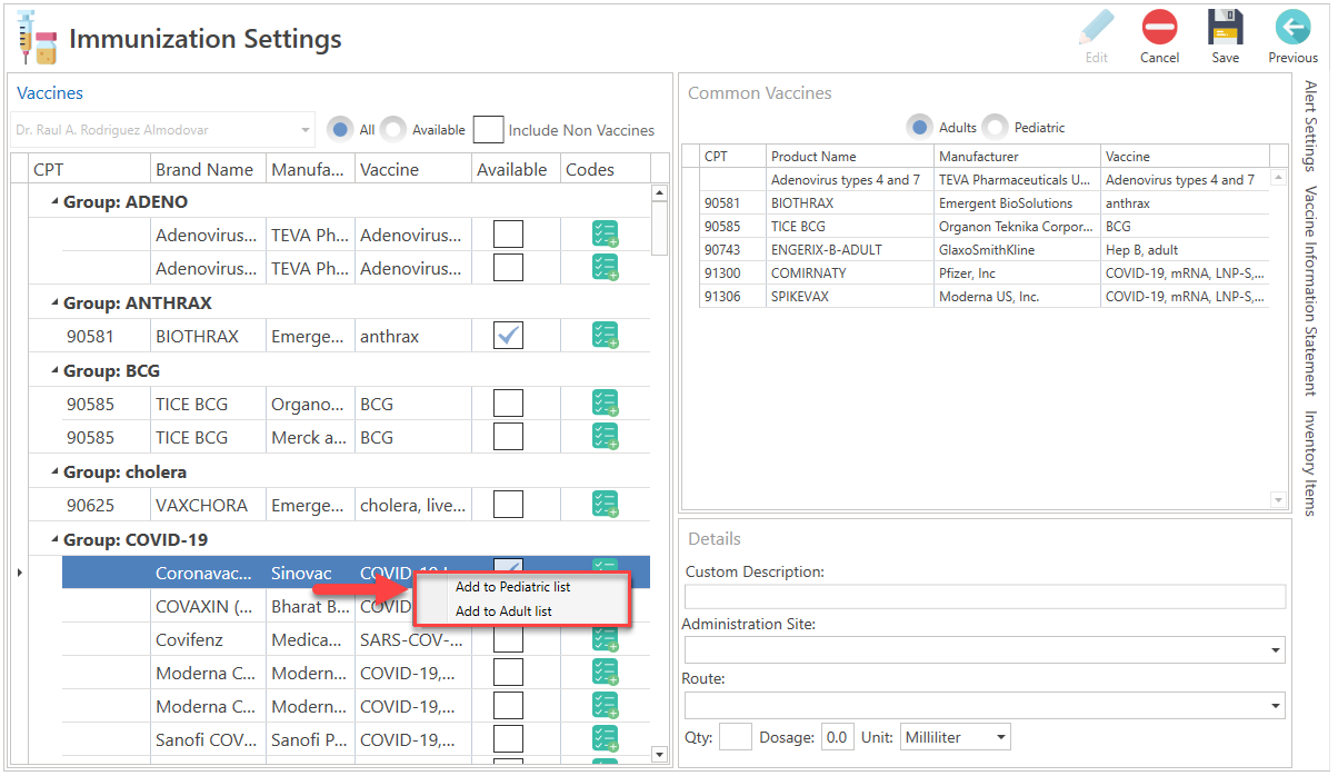- Once selected, click the right mouse button and select the options to add common adult vaccines or common pediatric vaccines.