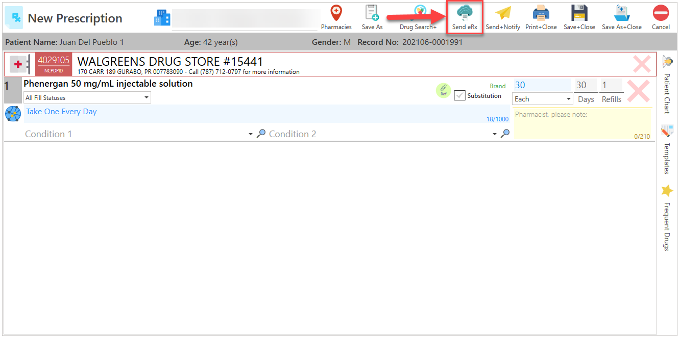 - If you wish to send the electronic prescription, press the Send eRx button, located at the top of the screen.