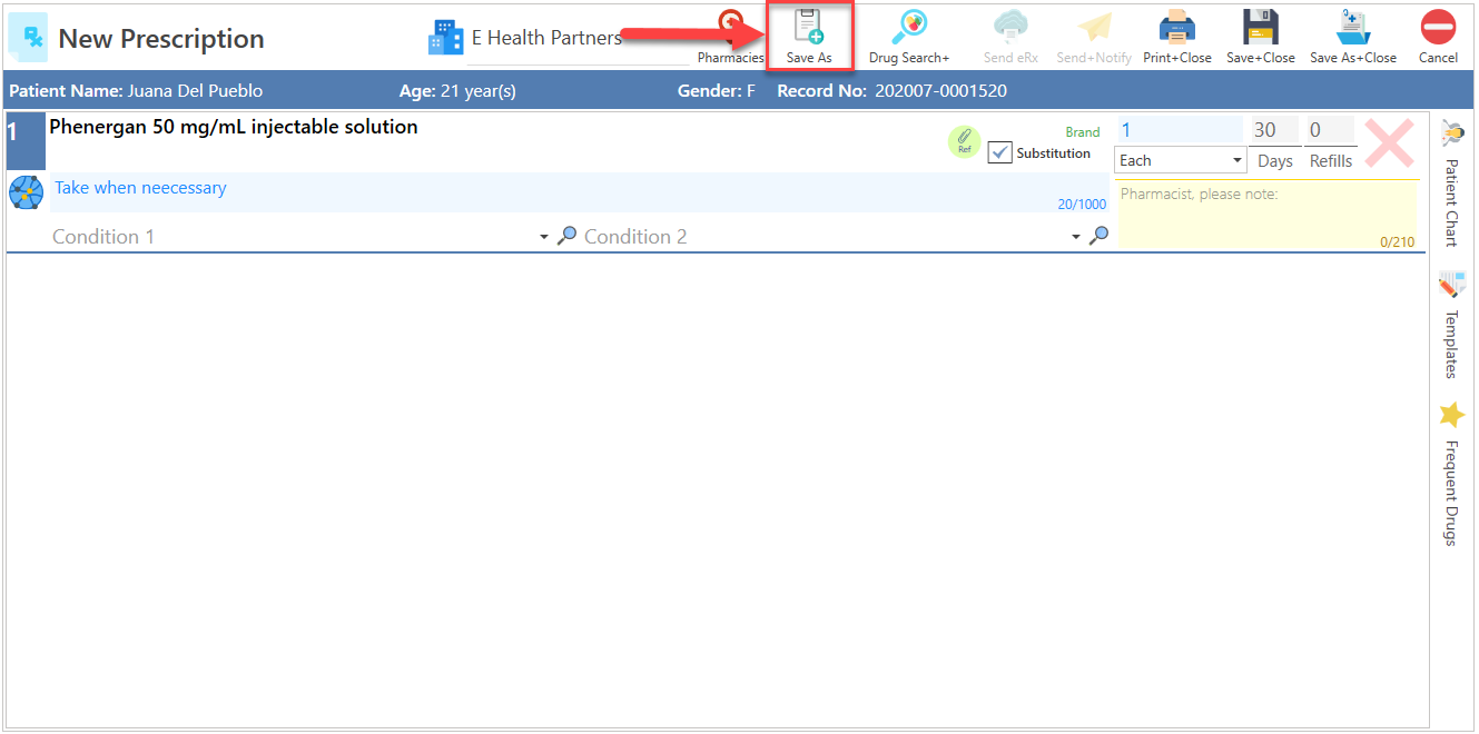 - Press the Save As button, located at the top of the screen, to set up the prescription template.