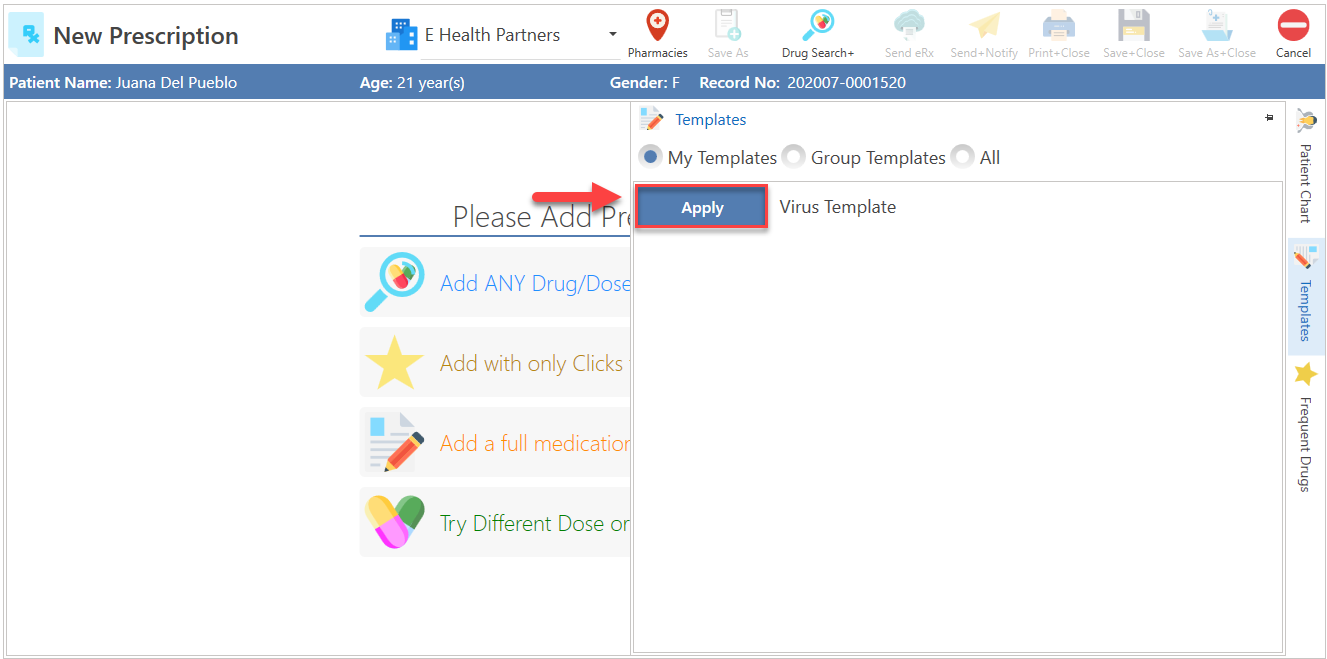 - Automatically, the prescription with the selected template will be displayed.