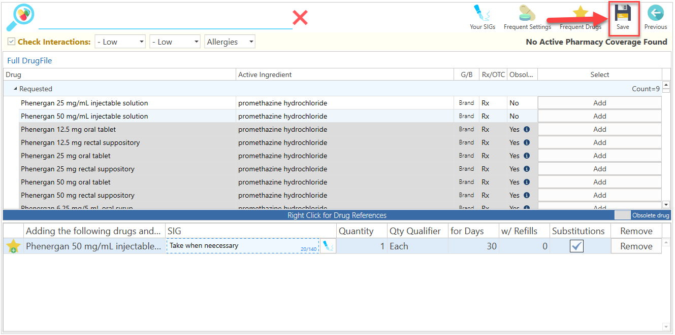 - Press the Drug Prescription button, located in the Side Bar section.