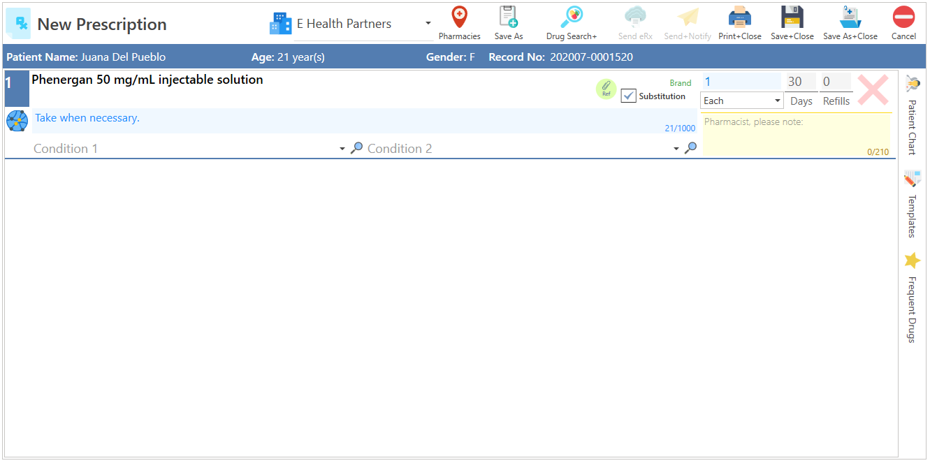 - If you only want to save the prescription, press the Save + Close button.