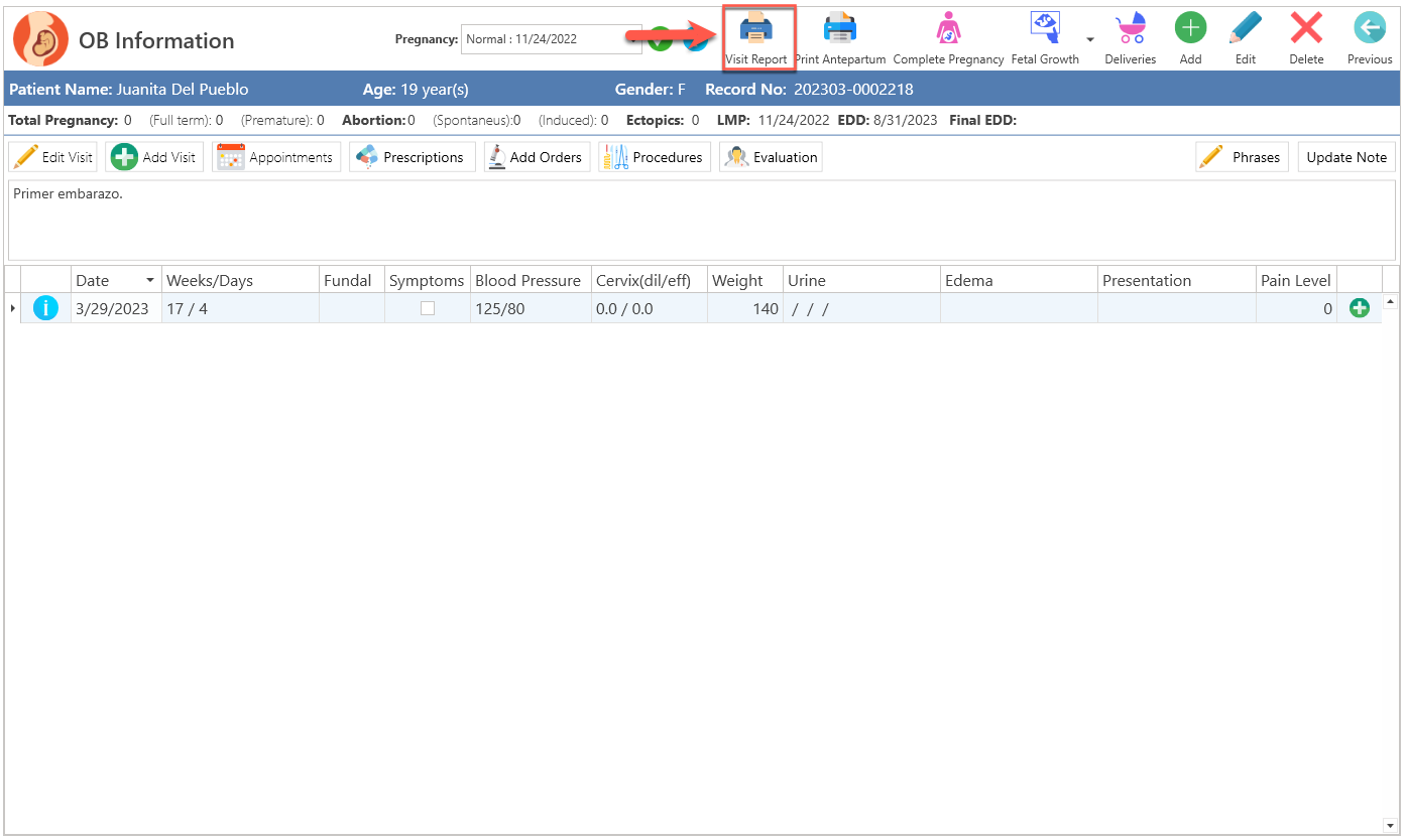 - To print the prenatal visit report, click on the Visit Print button located at the top of the screen.