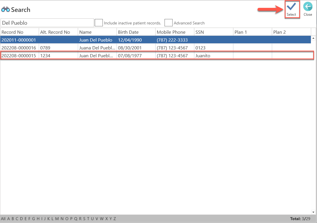 - Or, select the patient and then press the Select button located at the top of the screen.