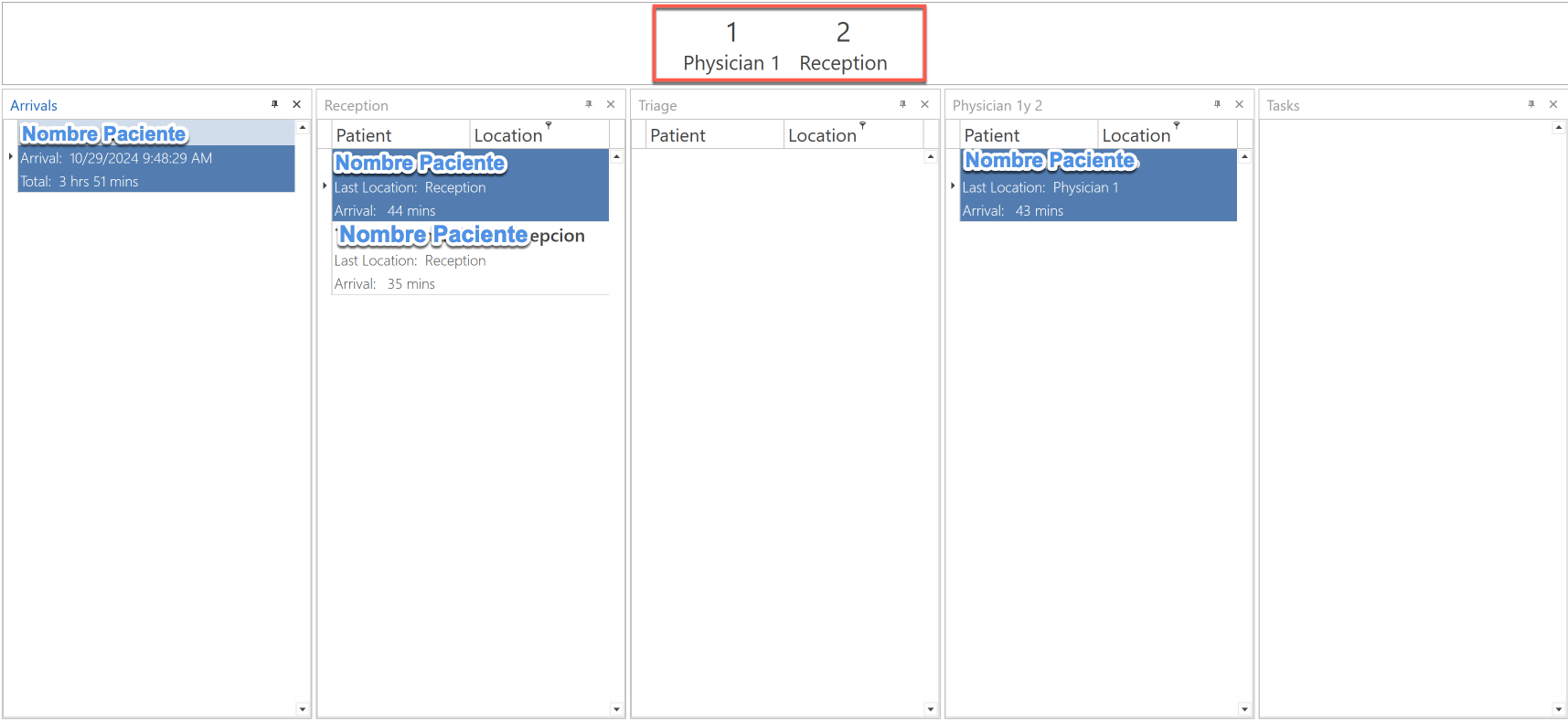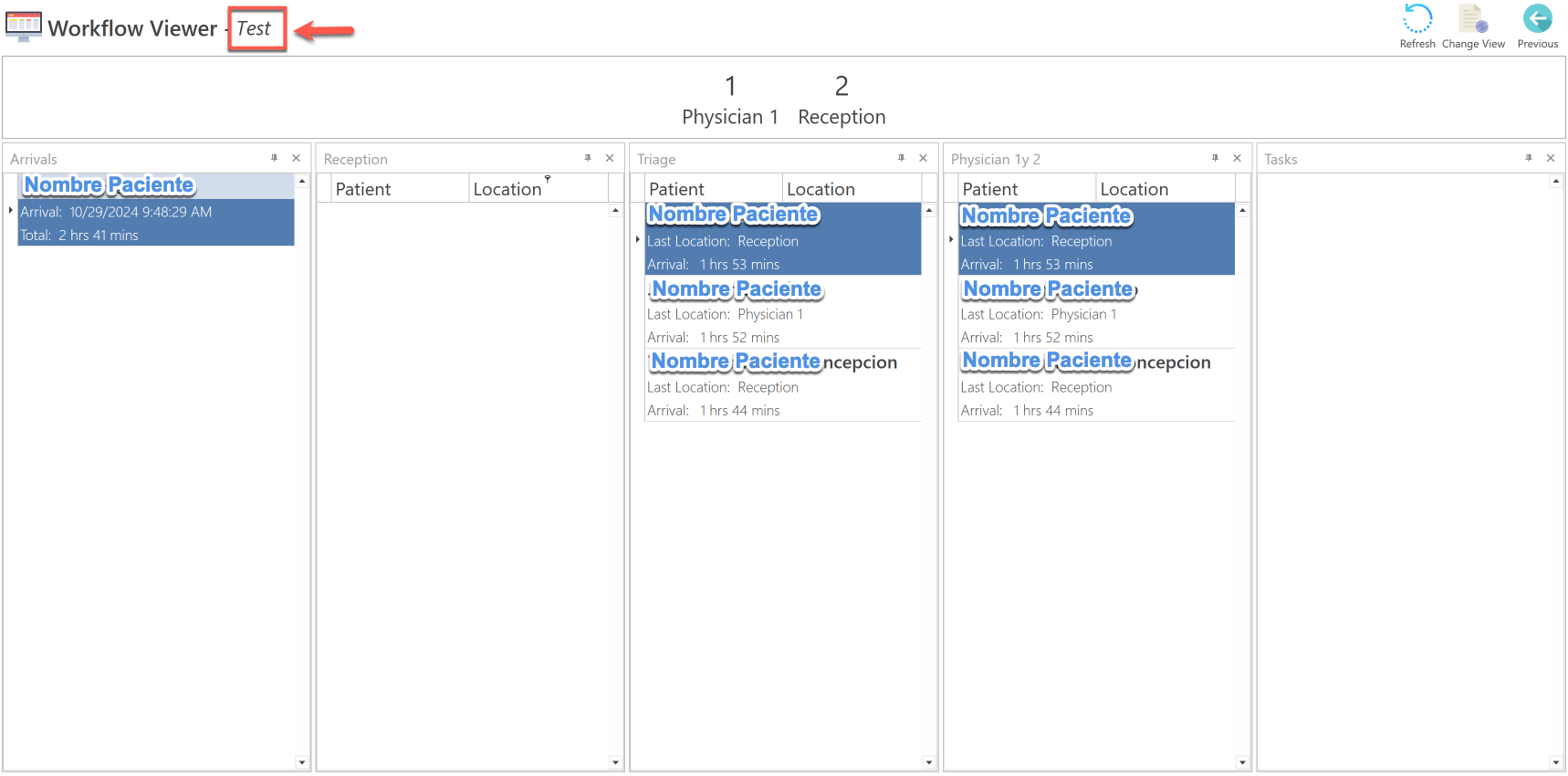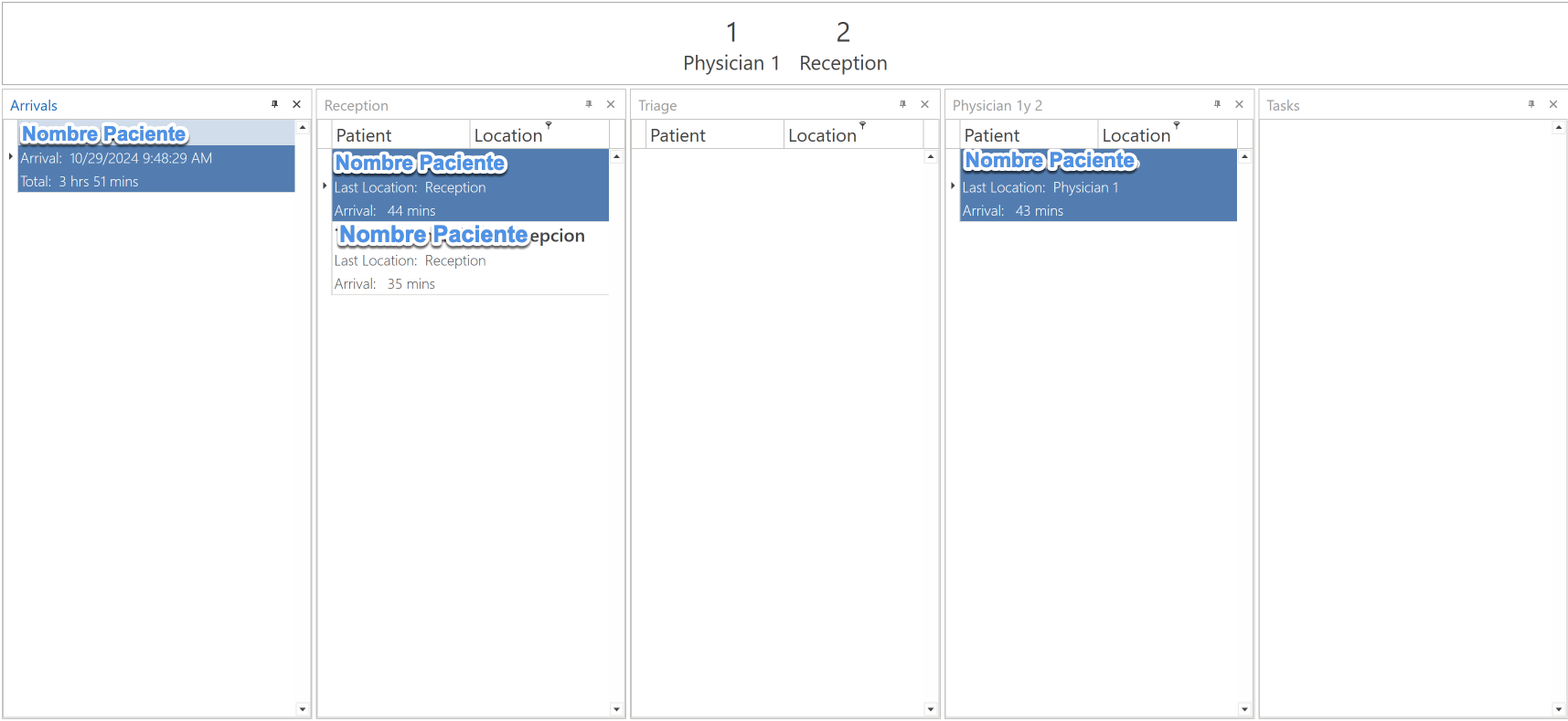 - Type the names of the evaluation room in the columns. The patients that were added in the Workflow screen and assigned to each evaluation room will be displayed in the columns.
