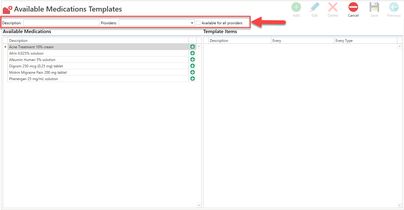 - Press the Add button, located next to the medication, that you want to add the configured template.