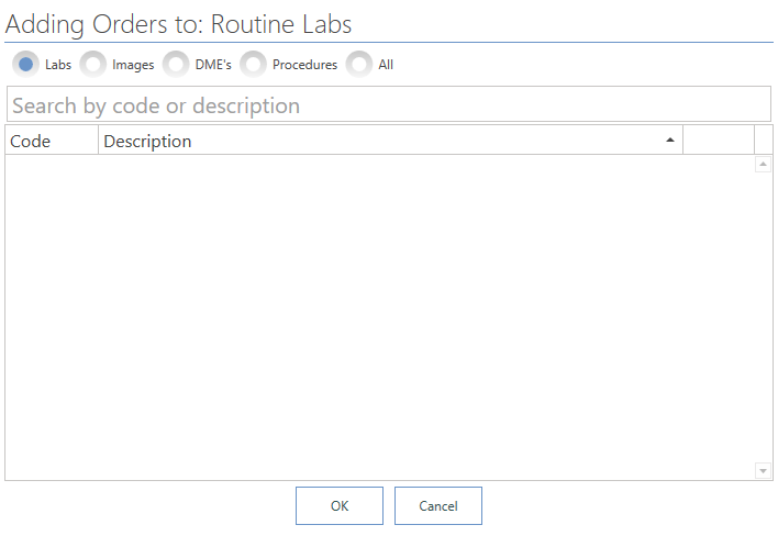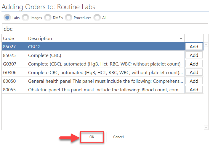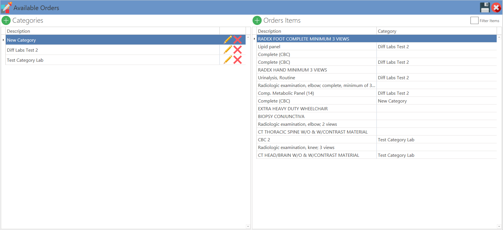 - To add laboratory orders to the configured or previously configured category, select the category in the Categories column and then press the Add button in the Order Items section.