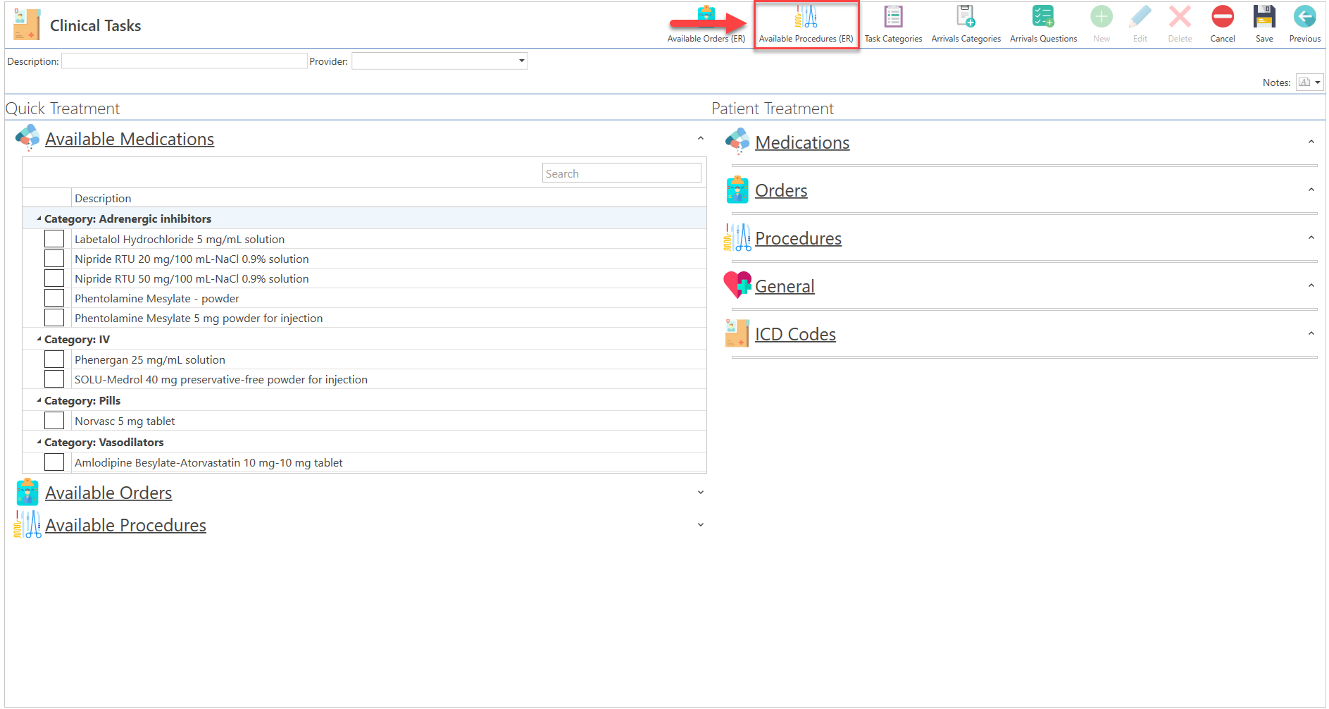 - To configure the available procedures, press the Available Procedures button, located at the top of the screen.