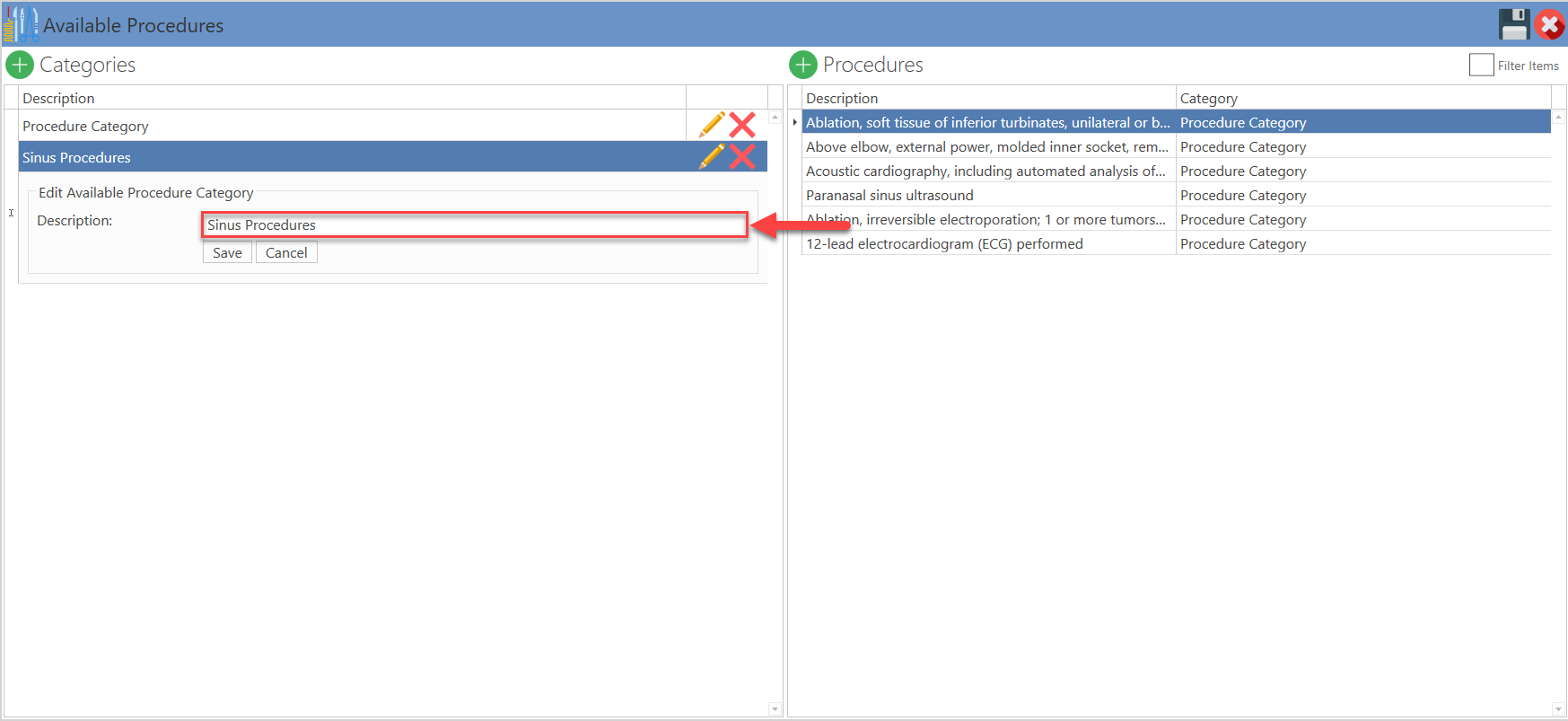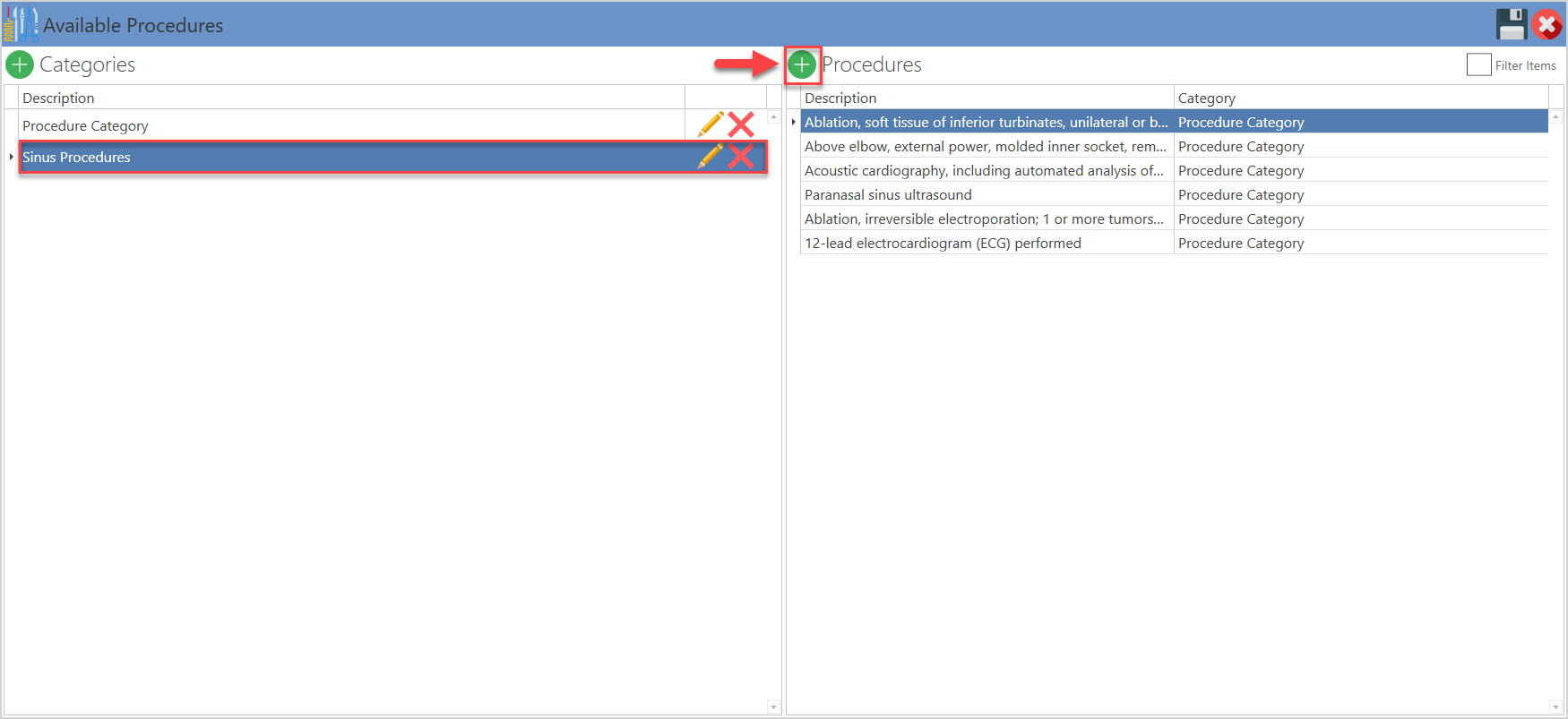 - To view only the procedures in a specific category, select the Filter Items checkbox at the top right of the screen.