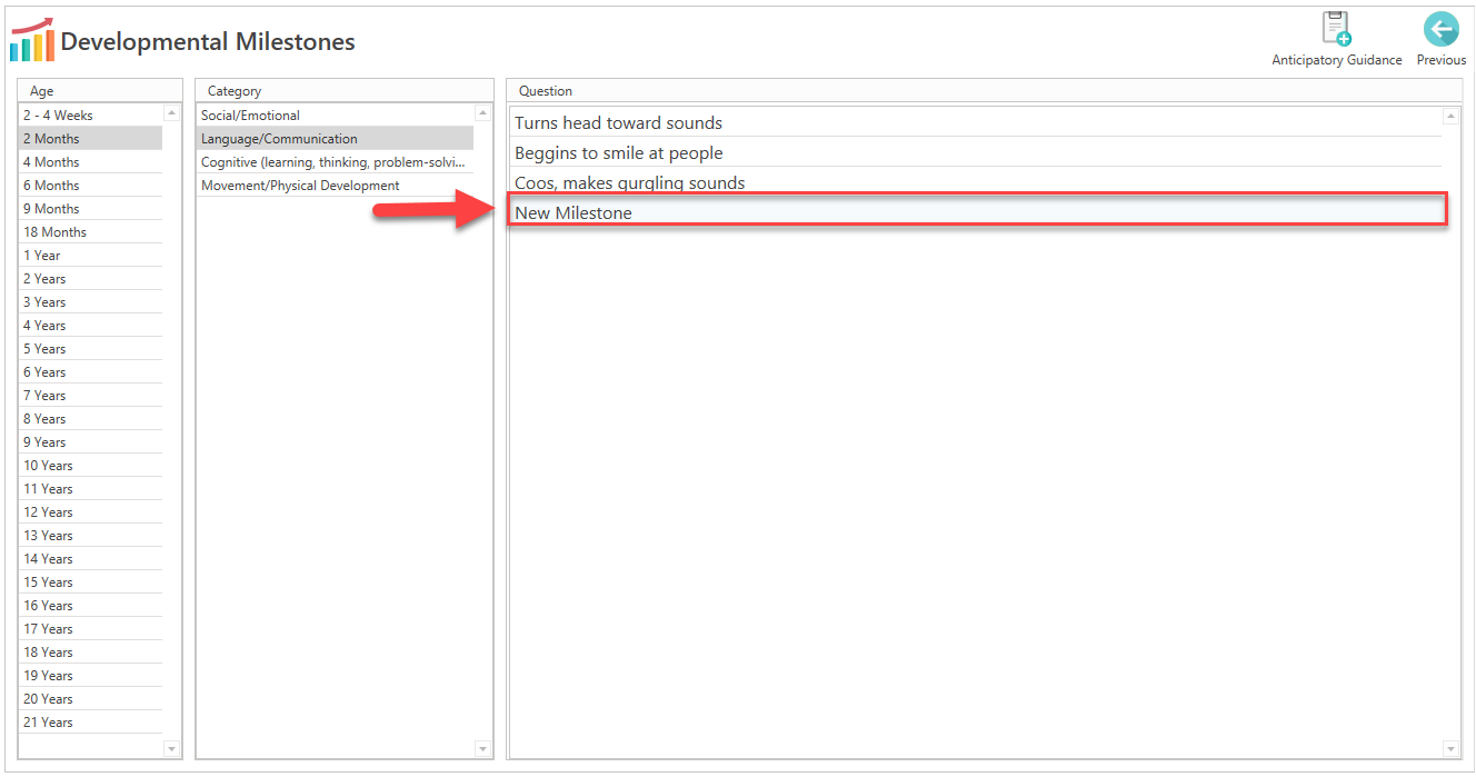 - It will be displayed on the Pediatric Developmental Milestones screen. (Note: You will need to restart the system to display the new measure).