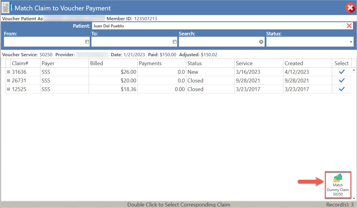 To match a claim to the check, select the claim with the icon.- Once selected, press the right mouse button and select the Match Claim option.