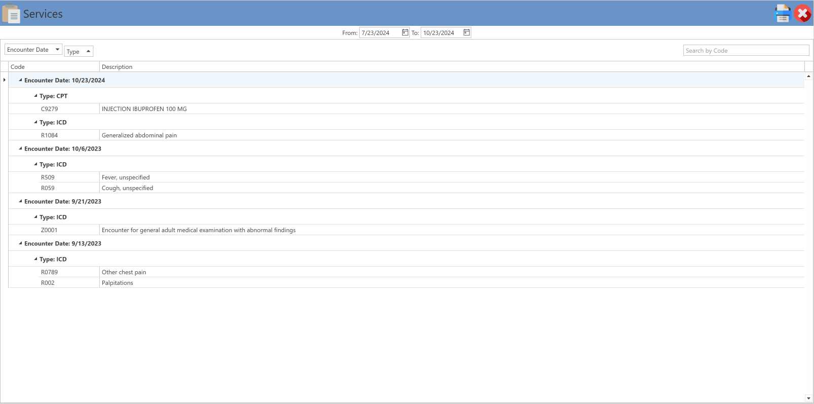 - Progress Notes: Section where all the clinical evaluations performed on the patient are displayed. They can be selected individually or all at once, if there is more than one encounter, to be printed.