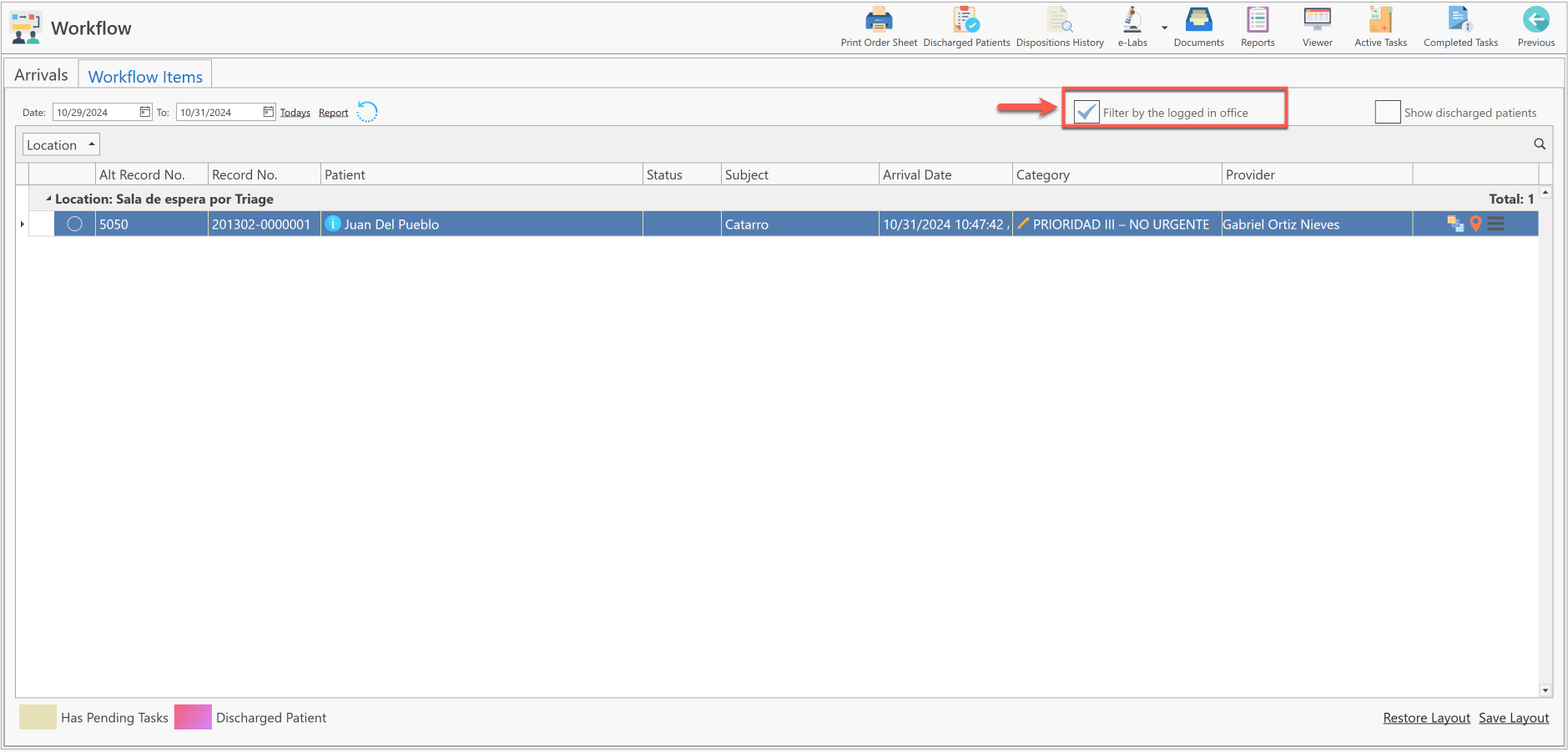 Main screen for patient management in an emergency room. The user will be able to perform several functions such as: configure the reason for the visit, print report of the orders sent to the patient, view the history of the patients that were removed from the Arrivals section, add documents, create reports of the patient management in the emergency room, view report of the pending and completed clinical tasks. It has two main areas: Arrivals and Workflow Items (these tabs are configured in the Settings / Office / Workflow Label Settings screen).